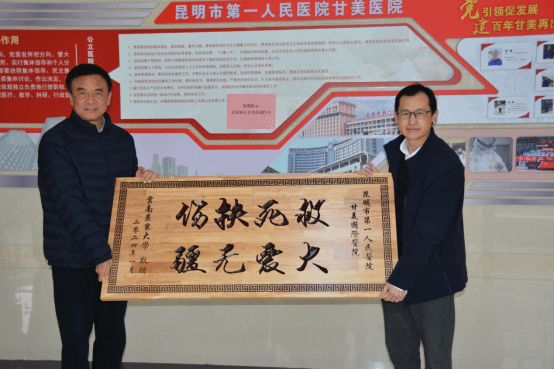 李国春代表公司向医院表示感谢,呈送了感谢信,并赠送“救死扶伤,大爱无疆”的牌匾,感谢医院在抢救公司杨春灿同学的过程中组织精锐力量,协同作战,以精湛医术和专业救治,使杨春灿同学得到了及时有效的救治,获得了第二次生命。甘美医院李震经理讲话中表示,救死扶伤是医院的神圣使命,也是医护人员的天职,只要有一丝希望都会尽百分百的努力挽救生命,同时,对公司坚持以生为本、关心关爱员工的理念而备受感动。座谈中,院校双方都表示希望以此为契机,加强院校双方的党建、团建、诊疗服务、青年教师和医护人员交流沟通等,推进双方深度合作。