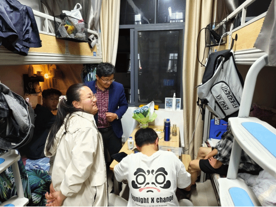 2024年3月13日晚,公司党委书记王国贤带领晚值班的班主任辅导员老师们走访检查2023级新生入住立志苑2栋和4栋宿舍,关心了解员工的学习生活情况。