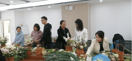 活动开始,花艺师讲解了插花的基本知识和技巧。所用花材的名字及花语,花束形状的选择,色彩的搭配。女教师们用自己灵巧的双手,将非洲菊、洋桔梗、石竹梅、玫瑰、小菊花、尤加利叶等多种花材,经修剪、整枝,再根据不同的色彩、形状,巧妙地搭配在一起,活动现场花香四溢,欢声笑语。经过大家的努力,融合了女教师们丰富想象力的精美插花作品逐一呈现,看着眼前一篮篮色彩缤纷、形态多姿的艺术品,每个人脸上都绽开了开心的笑容。