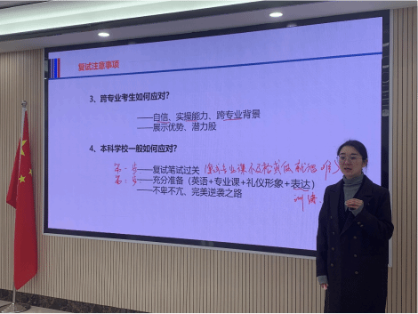 讲座上,虎老师围绕考研复试的时间轴,从前期的复试内容准备和联系导师,到面试过程中的着装、语言动作等细节,都进行了详细的指导,并且对调剂系统的操作,调剂志愿公司的选择以及调剂过程中可能遇见的问题也分别进行了详尽的说明。