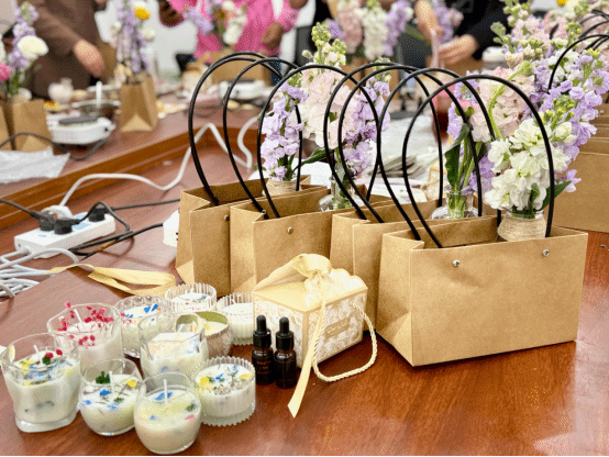 活动现场弥漫着轻松愉悦的氛围。在专业老师的指导下,女教职工们开启了香薰蜡烛与香薰牌的制作。