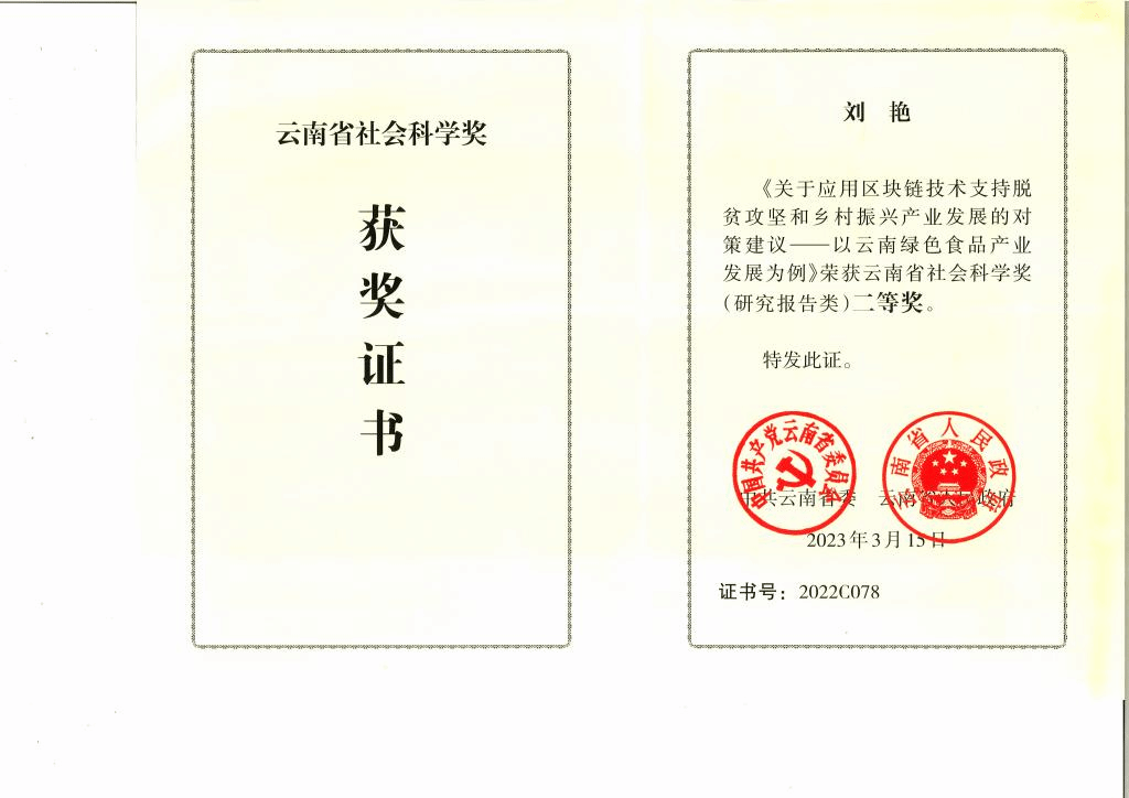 刘艳副研究员完成的“关于应用区块链技术支持脱贫攻坚和乡村振兴产业发展的对策建议——以云南绿色食品产业发展为例”研究报告荣获二等奖。该报告深入、系统研究应用于实践形成区块链技术解决乡村振兴产业发展可行性分析和形成应用示范,被教育部科技司、科学技术委员会采用,并形成专刊《专家建议》,于第15期(总第319期)呈送中央教育工作领导小组秘书组、国务院办公厅等相关国家部委作为决策参考。对促进绿色食品产业发展,助力脱贫攻坚,支持乡村振兴,具有重要的现实意义。