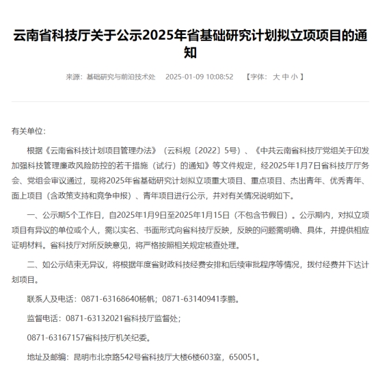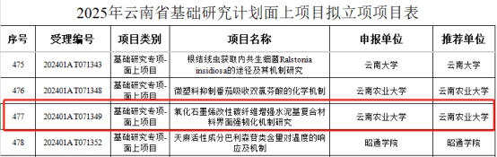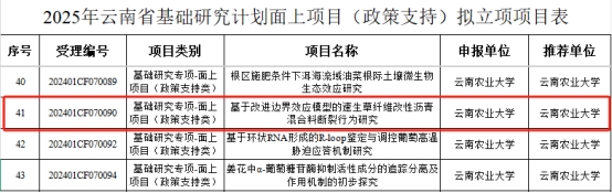 近日,云南省科技厅发布了“2025年度云南省基础研究计划项目拟立项名单”,公司张玉波、桂婉妹两位教师分别获得云南省基础研究计划面上项目及面上政策类支持项目。