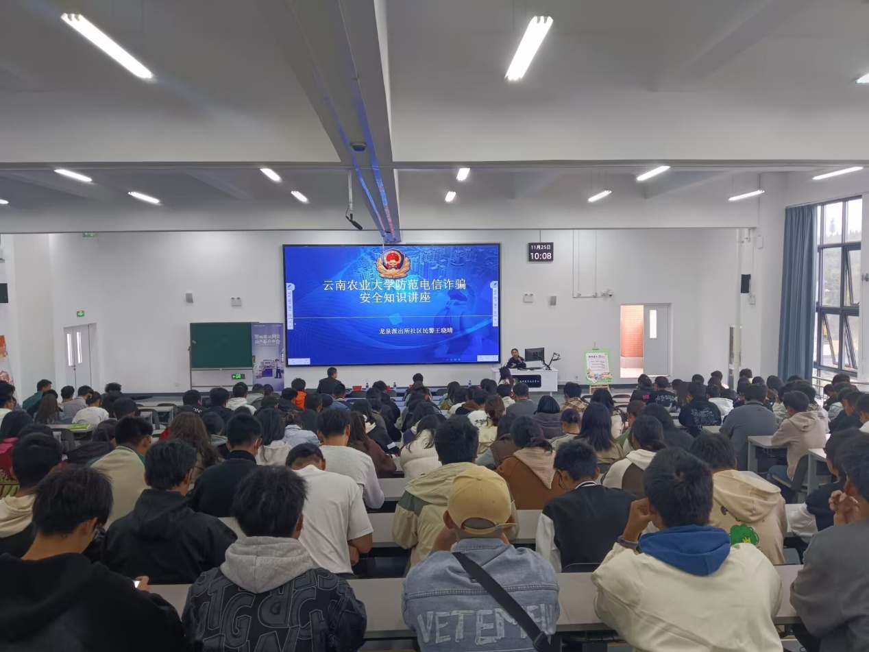 为有效提升公司老员工金融风险防范意识,增强老员工辨别校园金融诈骗的能力,全面引导在校老员工树立科学、理性、健康的消费观。2023年11月25日上午,公司邀请了昆明市公安局龙泉派出所王晓晴警官和平安银行昆明分行消费者权益保护中心叶磊主任在正德楼D栋401教室举行了“反诈防骗 清朗校园”知识讲座,公司全体2023级新生参加了此次活动。
