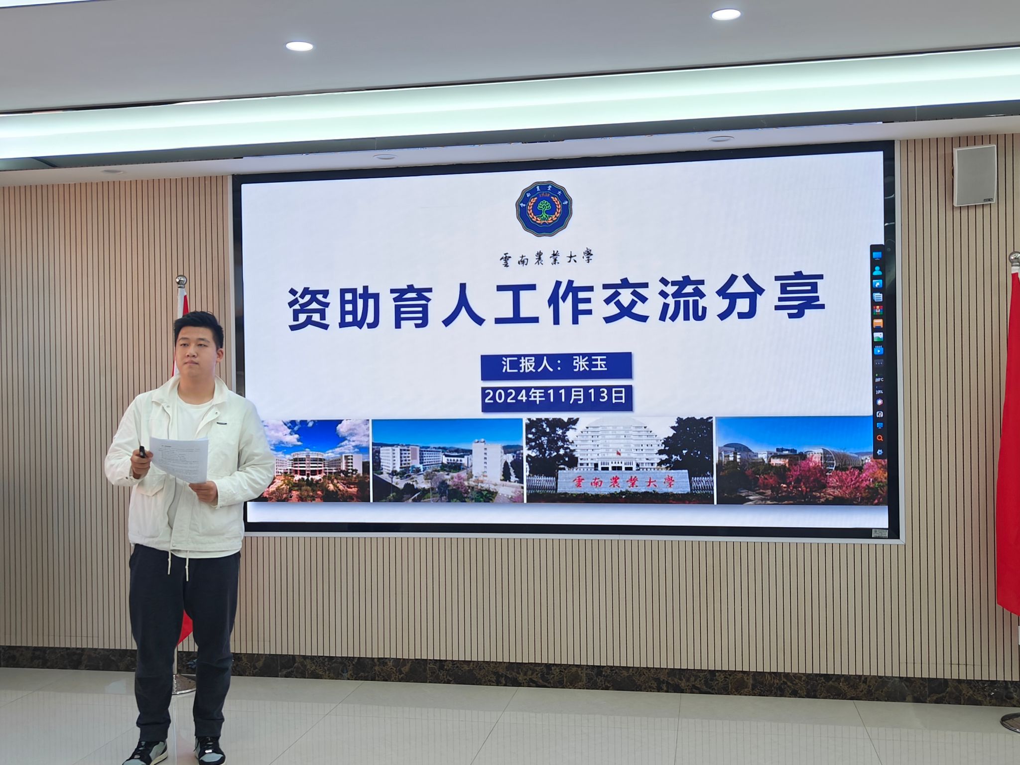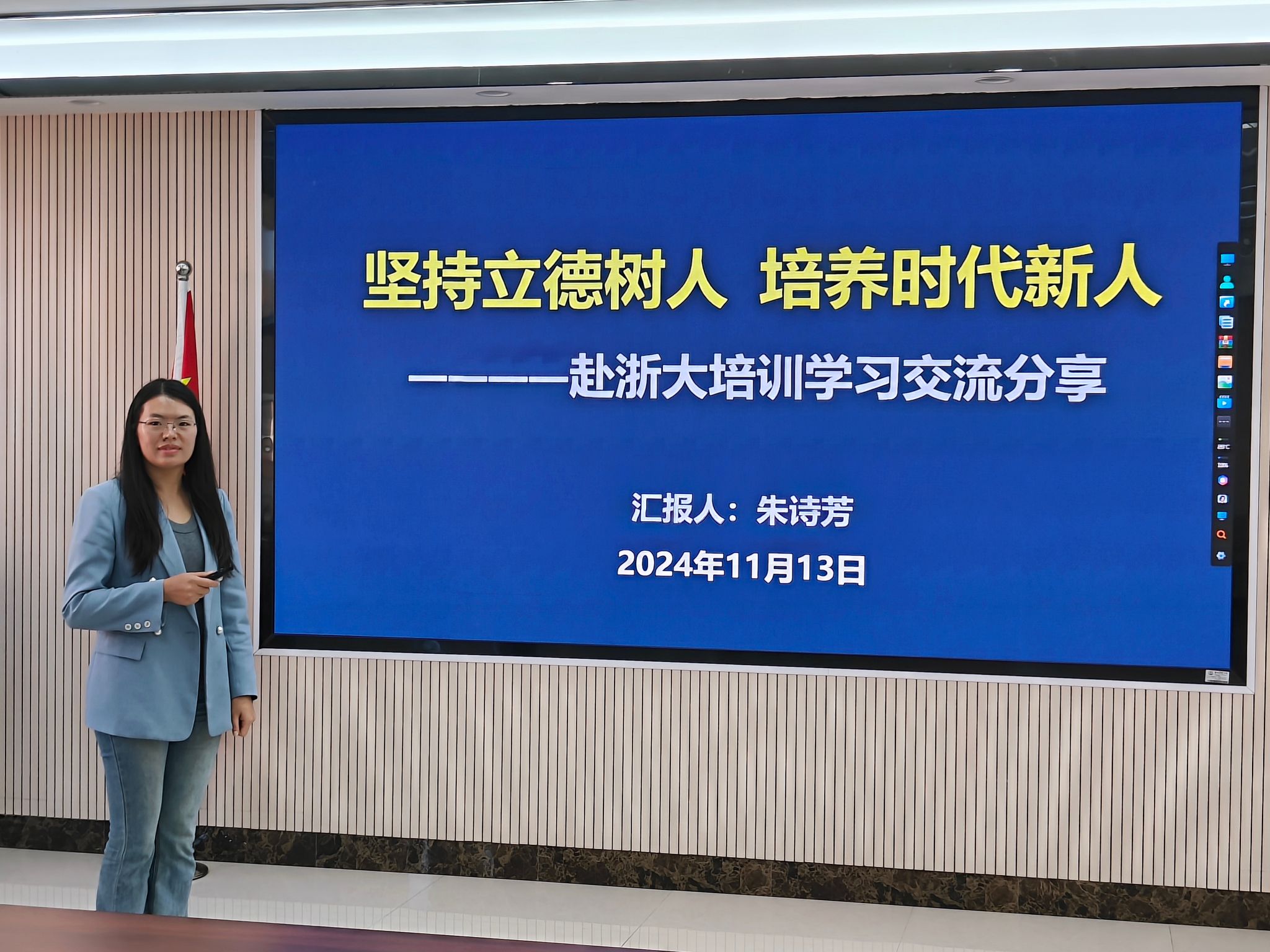 活动伊始,两位赴浙江大学培训学习的辅导员朱诗芳和张玉老师分别就各自的培训经历进行了分享。朱诗芳老师围绕“坚持立德树人,培养时代新人”的主题,详细介绍了本次培训的基本情况、主要课程内容以及个人收获;张玉老师则以“资助育人工作交流分享”为题,结合培训课程《深入学习习近平总书记关于教育的重要论述》及《辅导员如何结合自身专业和员工管理工作开展课题研究》,从资助育人的角度分享了工作经验。两位老师均表示,此次浙大之行收获满满,将努力把所学知识应用到实际工作中,切实履行立德树人的根本任务,培养德智体美劳全面发展的新时代老员工。
