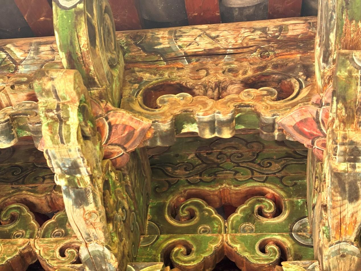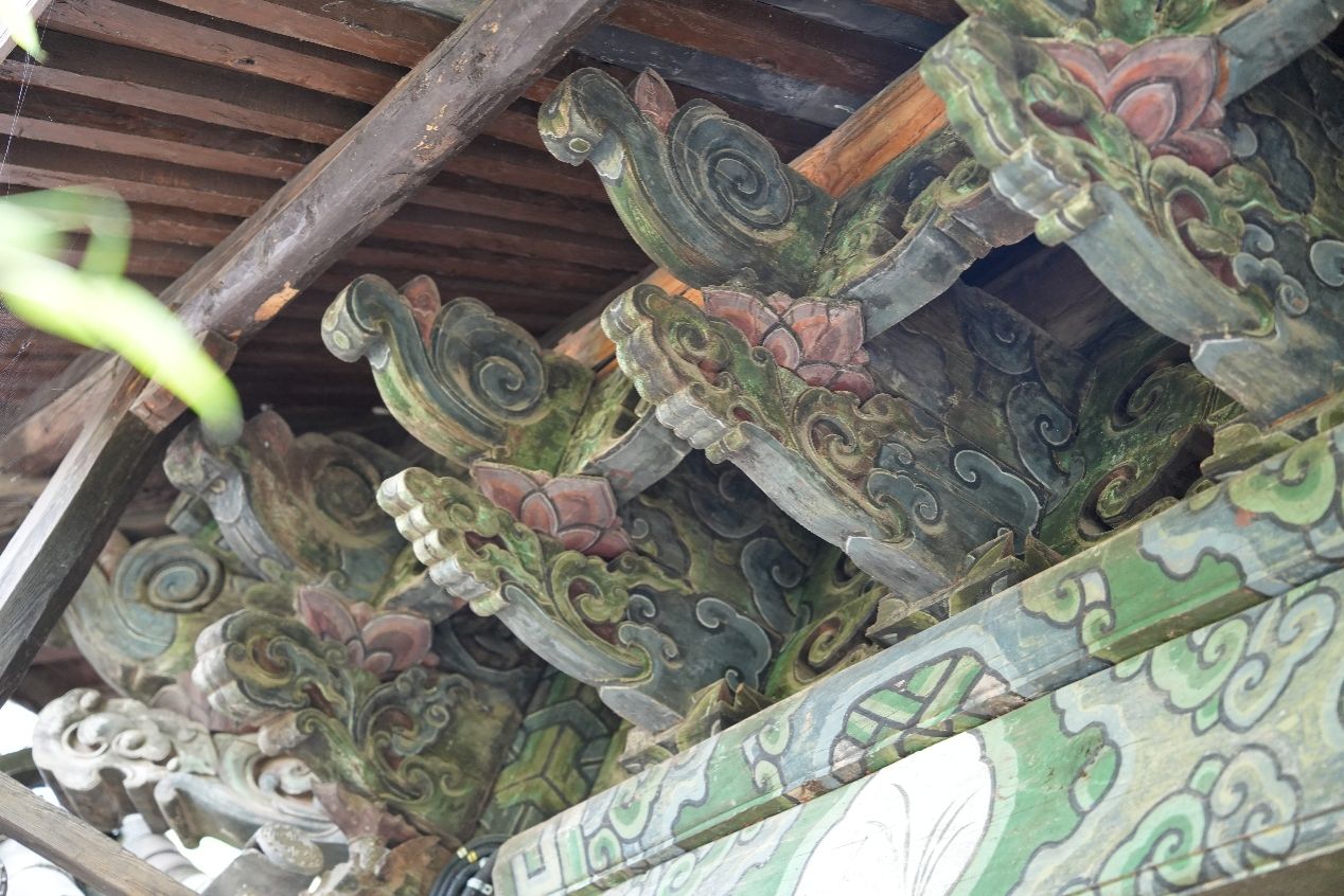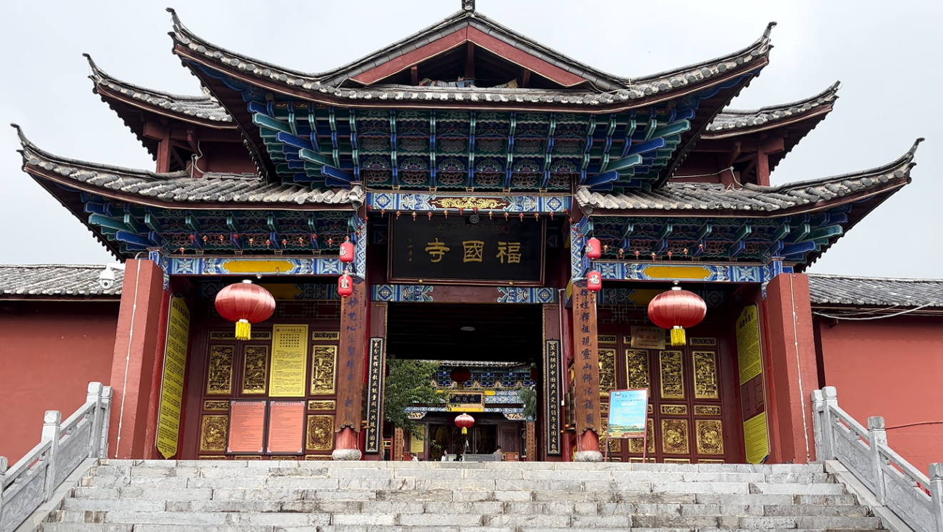 实践团队来到白沙古城,首先探访了位于白沙古镇西北郊的福国寺。丽江市福国寺静处白沙古镇一隅,青瓦木梁间,彩画成为古刹最鲜活的印记。梁柱与斗拱上的纹饰历经风霜,却依然光彩照人,堪称纳西佛画艺术的缩影。队员们走进寺庙,轻轻抚摸着那些古老的彩画,感受着岁月留下的痕迹。这些彩画不仅展现了纳西族佛教艺术的独特魅力,也反映了当时社会的宗教信仰和文化风貌。