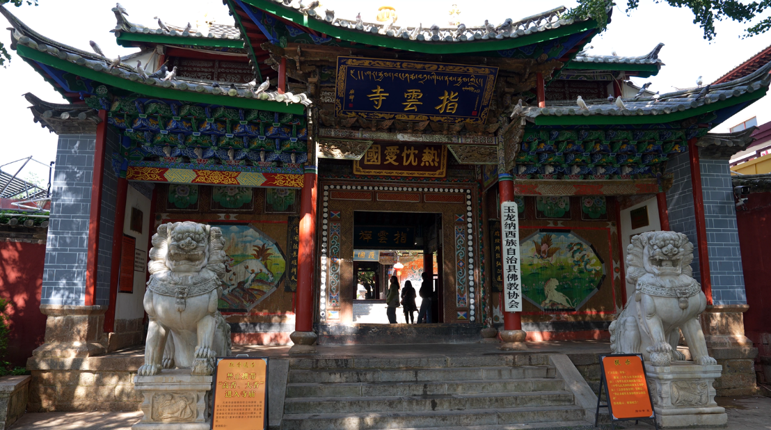 实践团队的首站,是静卧于丽江坝子西陲拉市海畔的指云寺。抬眼望去,指云寺的彩画宛如一幅幅立体的史诗,在梁柱斗拱间徐徐铺陈开来,瞬间吸引了队员们的目光。大家不禁对其彩绘的色彩啧啧称赞,画师们巧妙运用矿物颜料调制的朱砂红、石绿、群青,在木构件上层层晕染,历经百年风雨的洗礼,依然鲜亮如新,仿佛时间在这里放慢了脚步。这些色彩不仅展现了古代画师高超的技艺,更承载着指云寺悠久的历史和深厚的文化底蕴。队员们穿梭于寺庙的殿堂之间,仔细观赏每一处彩画,试图从那细腻的笔触和绚丽的色彩中,探寻到古代佛教文化的奥秘。
