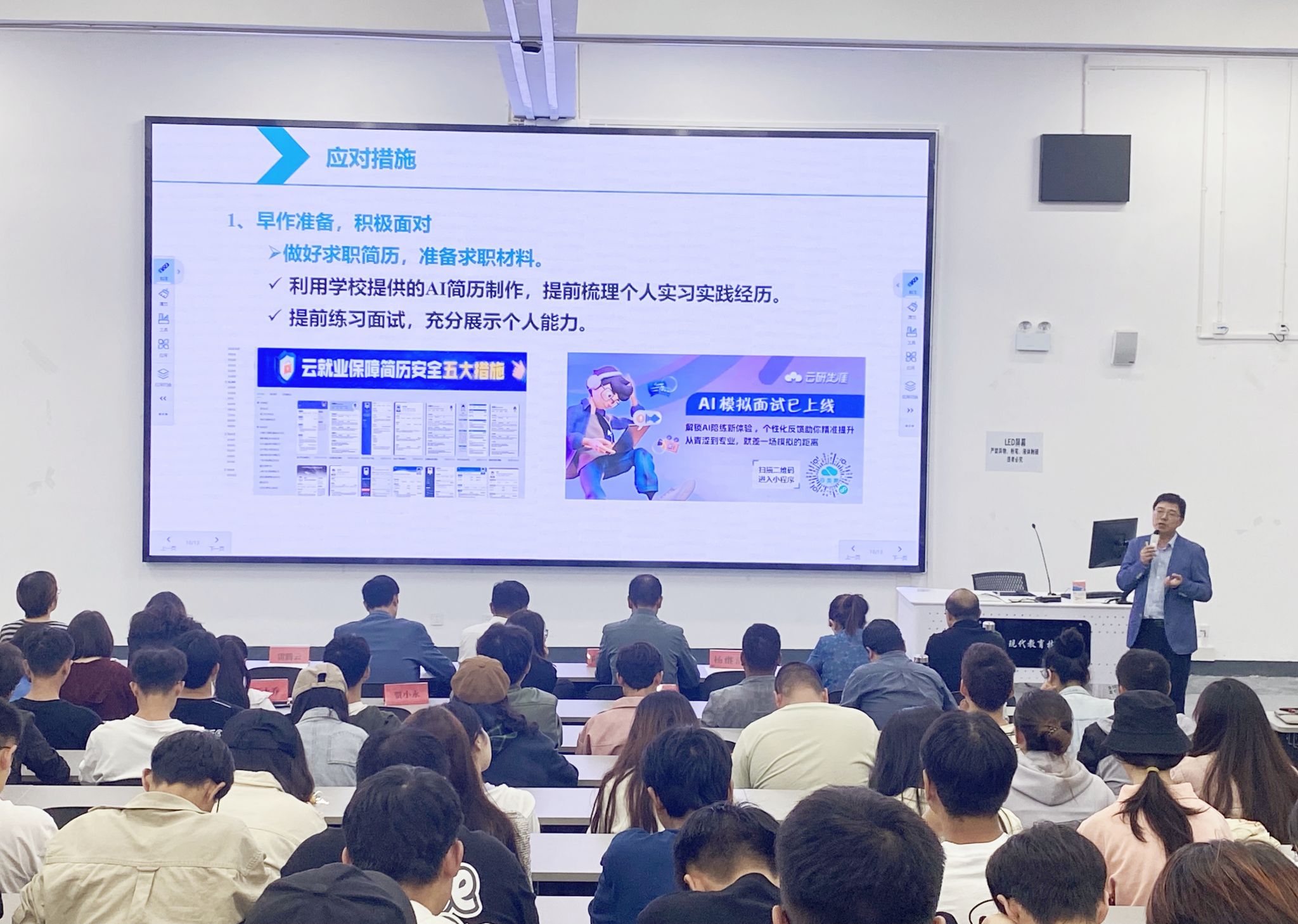 会上,邀请了公司就业与创新创业指导服务中心副主任雷腾云老师,对当前就业形势及招聘情况、毕业生求职进行了指导。雷老师结合详实的数据,深入分析了目前招聘情况和面临的形势,提出“早做准备、积极面对”、“主动出击、拓展渠道”、“调整预期、合理定位、实现多元化就业”等实际措施,为毕业生下一步求职就业提供有效指导和帮助。
