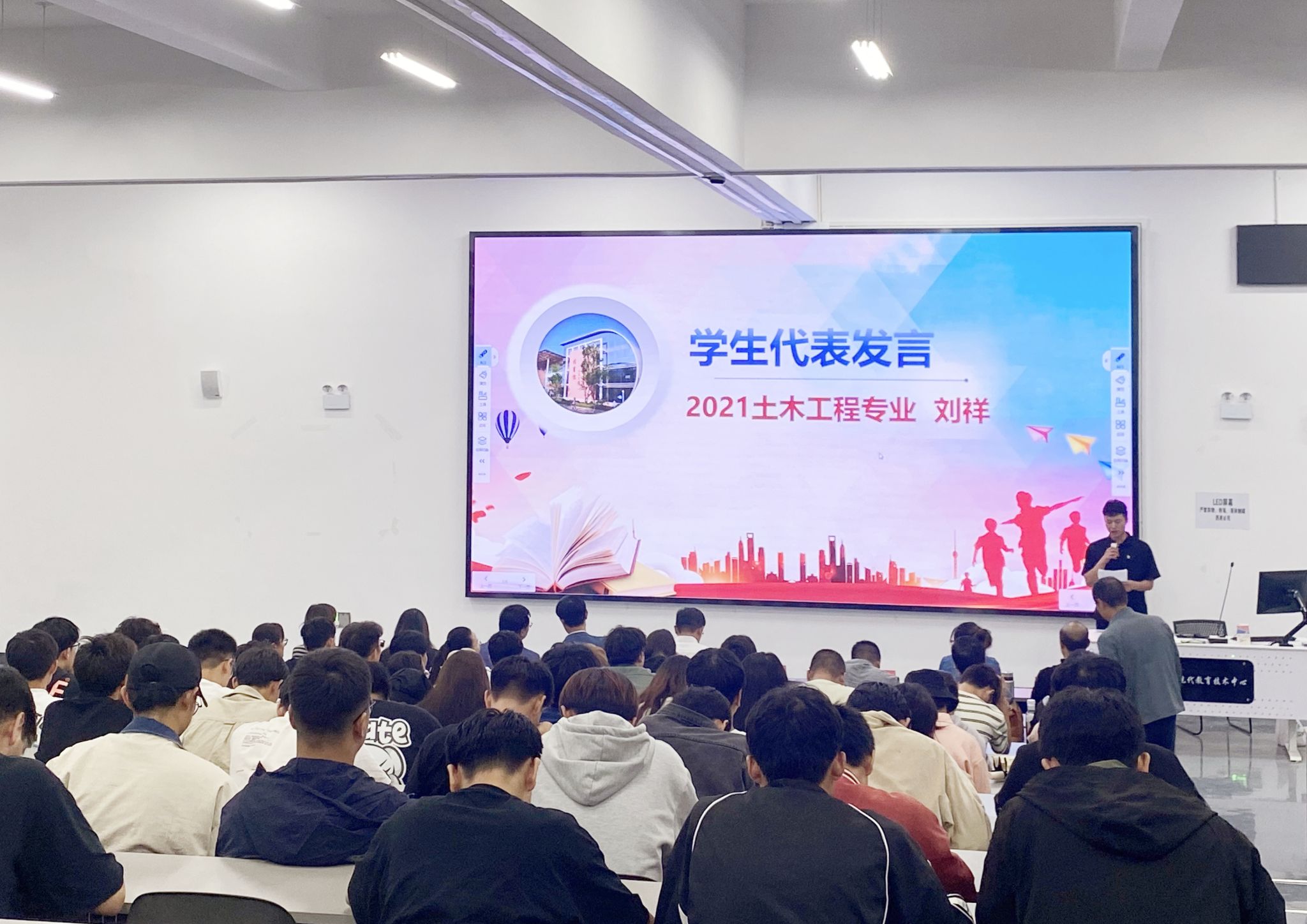 2021级土木工程刘祥同学作为毕业生代表进行发言,他结合自身经历,向同学们分享了求职感悟,鼓励同学们树立积极就业、主动出击、先就业再择业的求职心态。同时也要学会多元化就业和发展,在做好考研准备的同时,积极求职就业,努力提升自身专业知识水平和能力,为自己的未来增添多种选择和机会。