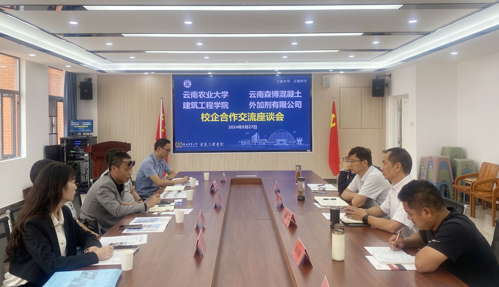为了进一步压实和推动院企合作。9月27日下午,员工企业云南森博混凝土外加剂有限公司董事长、公司1999级优秀员工阿光强等一行5人到公司进行院企合作交流座谈,公司党委书记王国贤、副书记陆志炳、张玉波博士、郭子涛博士等参加座谈。